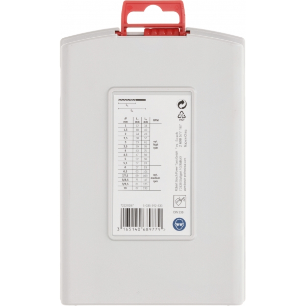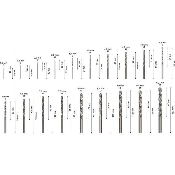 | Información adicional | Diámetro de broca: 1, 1.5, 2, 2.5, 3, 3.5, 4, 4.5, 5, 5.5, 6, 6.5, 7, 7.5, 8, 8.5, 9, 9.5, 10 mm Longitud de trabajo: 12, 18, 24, 30, 33, 39, 43, 47, 52, 57, 57, 63, 69, 69, 75, 75, 81, 81, 87 mm |