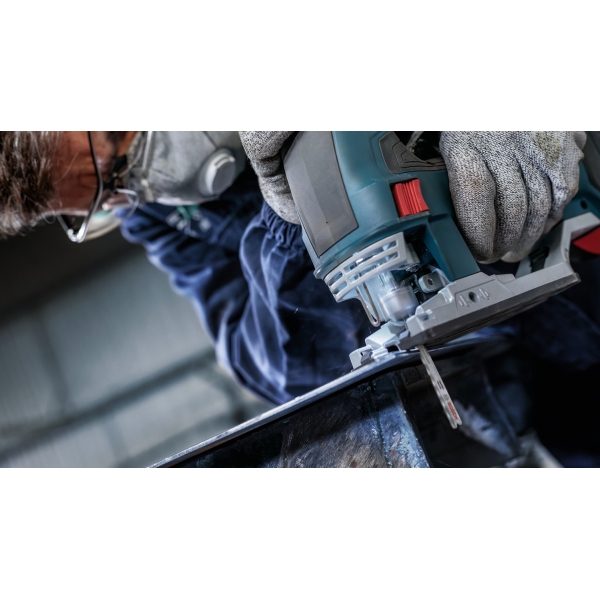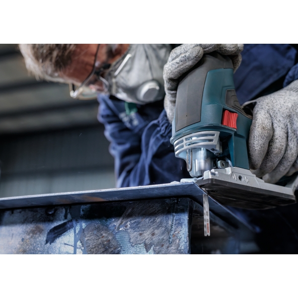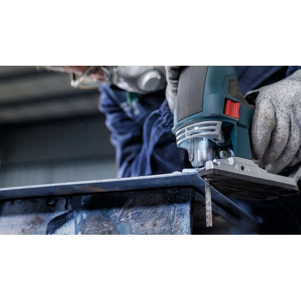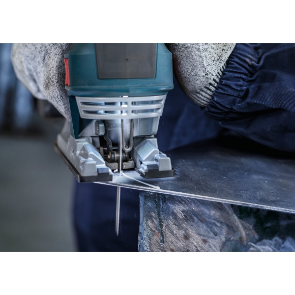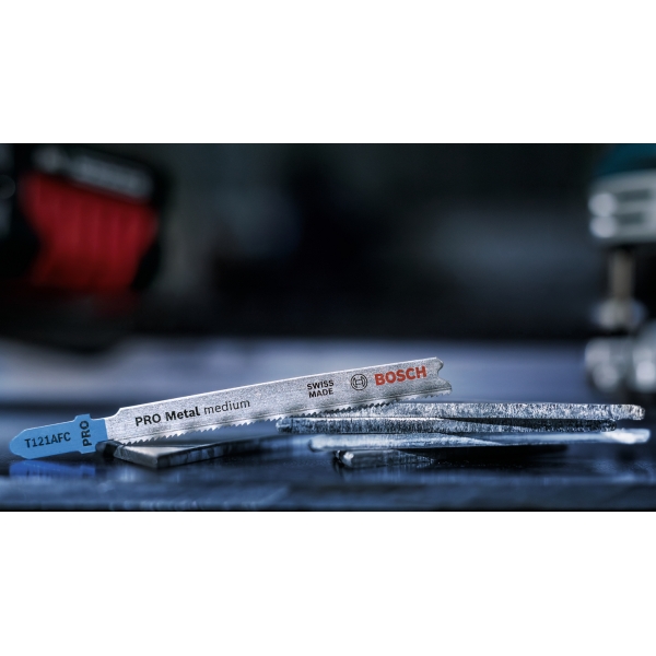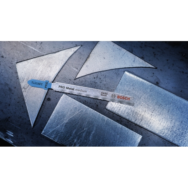 La hoja de sierra de calar PRO Metal Medium T121AFC está fabricada en bimetal: cuenta con una banda de dientes de acero rápido (HSS) con recubrimiento de nitruro de aluminio y titanio (AlTiN), adherida a un cuerpo de acero de alto carbono (HCS) para mayor resistencia y durabilidad. La geometría de los dientes (dientes robustos y fresados con patrón ondulado), el cuerpo cónico de la hoja y su perfil delgado garantizan un corte suave. Úsela para cortar chapa metálica de grosor medio a fino con un espesor de entre 1 y 3 mm.