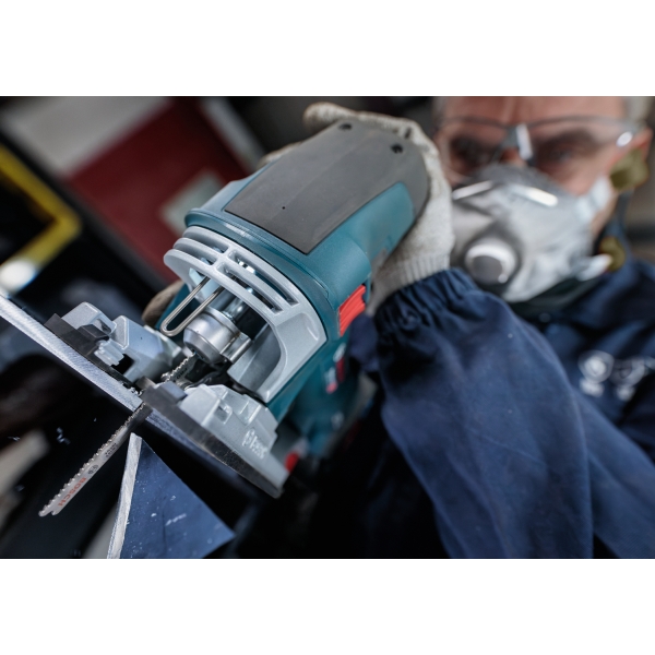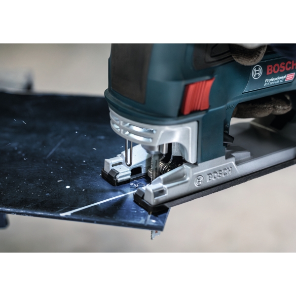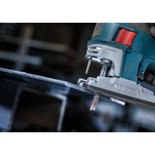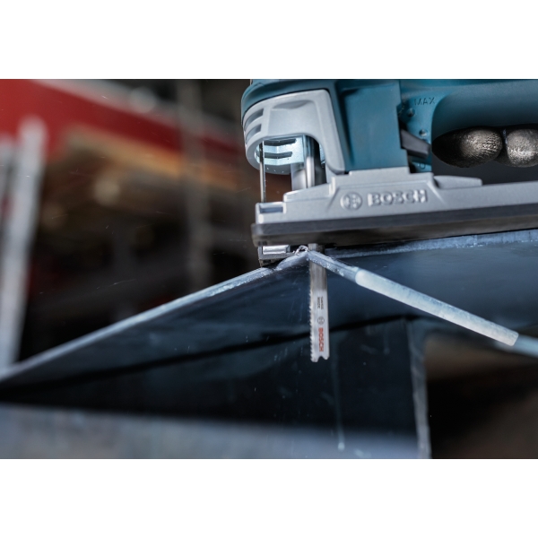La hoja de sierra de calar PRO Metal T121BFC gruesa está fabricada en bimetal: cuenta con una banda de dientes de acero de alta velocidad (HSS) con un recubrimiento de nitruro de aluminio y titanio (AlTiN) adherida a un cuerpo de acero de alto carbono (HCS) para mayor resistencia y durabilidad. La geometría de los dientes (dientes robustos y fresados con patrón ondulado), el cuerpo cónico de la hoja y su perfil delgado garantizan un corte suave. Úsela para cortar chapa de espesor medio, con un grosor de entre 2,5 y 6 mm.