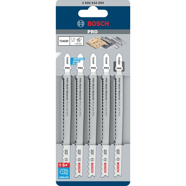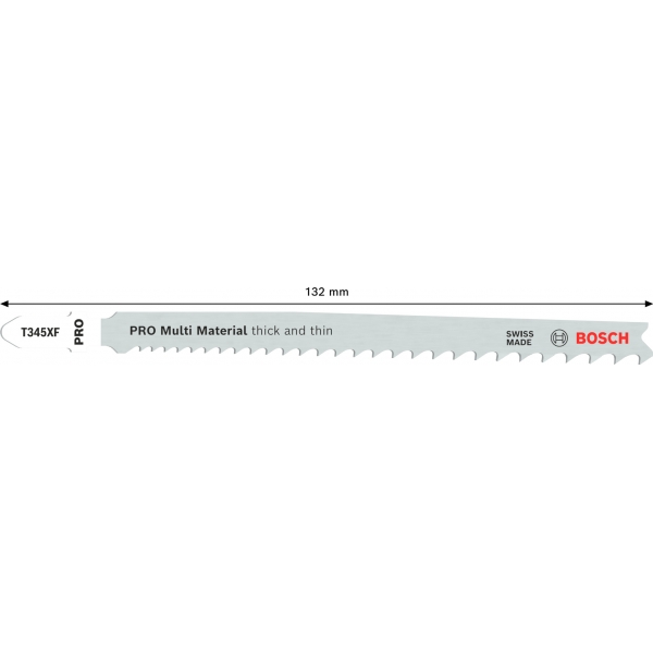 La hoja PRO Multi Material, gruesa y fina, T345XF, está fabricada en bimetal: cuenta con una banda de dientes de acero de alta velocidad (HSS) unidos a un cuerpo más elástico de acero de alto carbono (HCS) para ofrecer la resistencia y flexibilidad necesarias para trabajar con madera y metal. Los dientes fresados de la hoja, dispuestos en un lado, garantizan cortes rápidos, mientras que el paso progresivo de los dientes permite cortar una amplia gama de materiales. La hoja tiene 132 mm de longitud, lo que permite cortar piezas de hasta 65 mm de grosor.