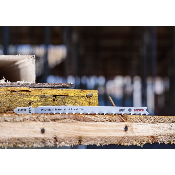 Al cortar madera, golpear un clavo o un tornillo puede dañar fácilmente una hoja de sierra de calar estándar. Pero no así esta versátil hoja PRO Multi Material, gruesa y fina, T345XF. La creamos para ayudarle a obtener cortes rápidos y rectos en piezas de trabajo de diferentes grosores, con fijaciones de acero de resistencia estándar.