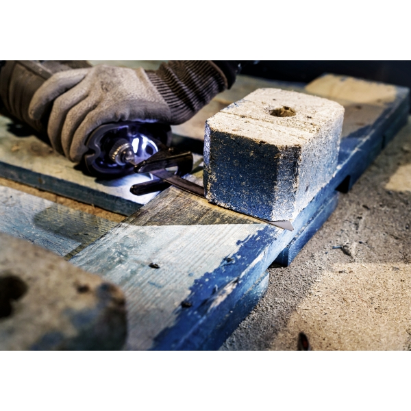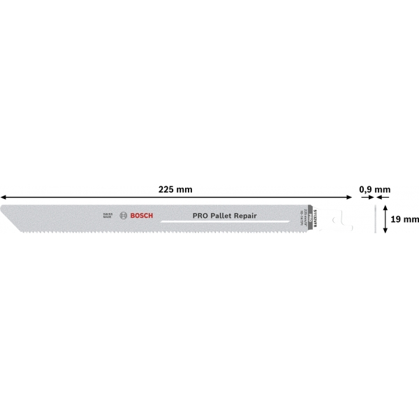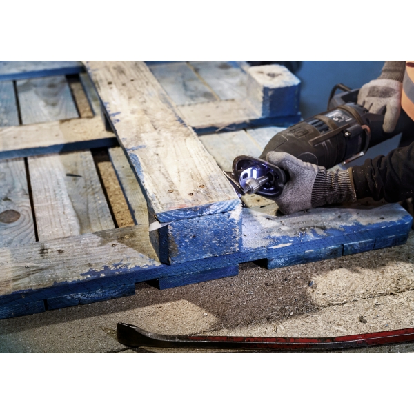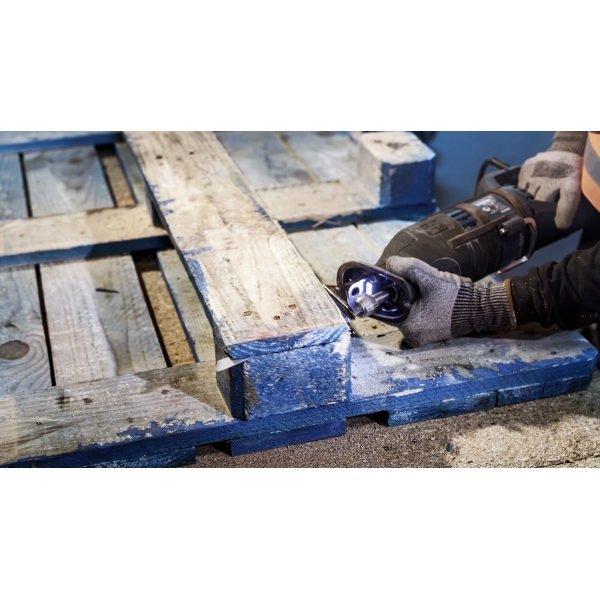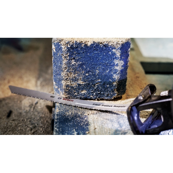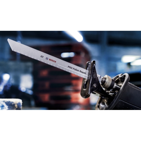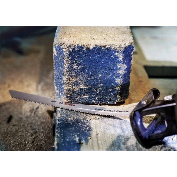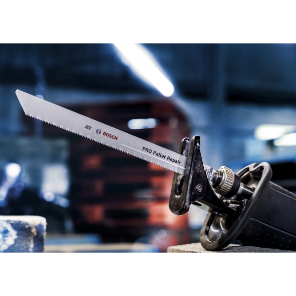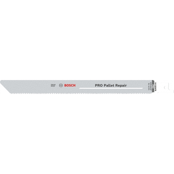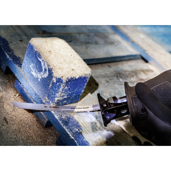 La cuchilla PRO Pallet Repair S1132VFR está diseñada para ofrecer resistencia, un corte cómodo y bajas vibraciones. El innovador diseño del estabilizador de eje Bosch aumenta considerablemente su robustez, la punta invertida evita golpes y la flexión de la cuchilla en impactos frontales, y la cuchilla combina dientes HSS endurecidos con un cuerpo HCS extremadamente flexible.