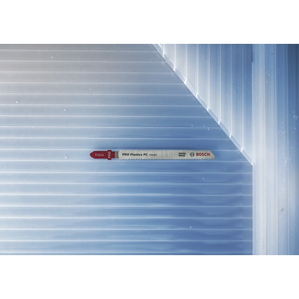 La hoja de sierra de calar PRO Plastics PC clean T101A es una excelente opción para profesionales que necesitan cortar plásticos sensibles al calor como el PC (policarbonato). La hemos fabricado con acero de alto carbono (HCS) y le hemos dado un cuerpo cónico y dientes de paso fino afilados por fricción para garantizar cortes limpios sin derretir el plástico. Úsela para cortar láminas de PC de entre 2 y 20 mm de espesor.
