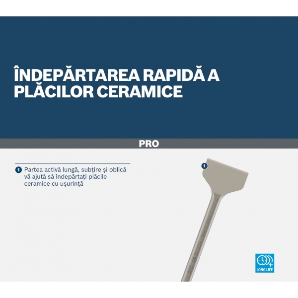 La capacidad de retirar azulejos sin romperlos facilita el trabajo del renovador. Hemos creado el cincel para azulejos de cerámica PRO SDS max-4C con un lado activo ancho para ayudarle a retirar azulejos y gres de forma eficiente.