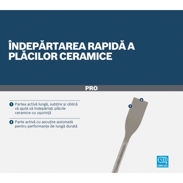 La posibilidad de retirar azulejos sin romperlos facilita el trabajo del renovador. Hemos creado el cincel para azulejos de cerámica PRO SDS max-5C con una parte de trabajo larga e inclinada para garantizar que pueda usarlo para retirar azulejos de forma limpia y eficiente.