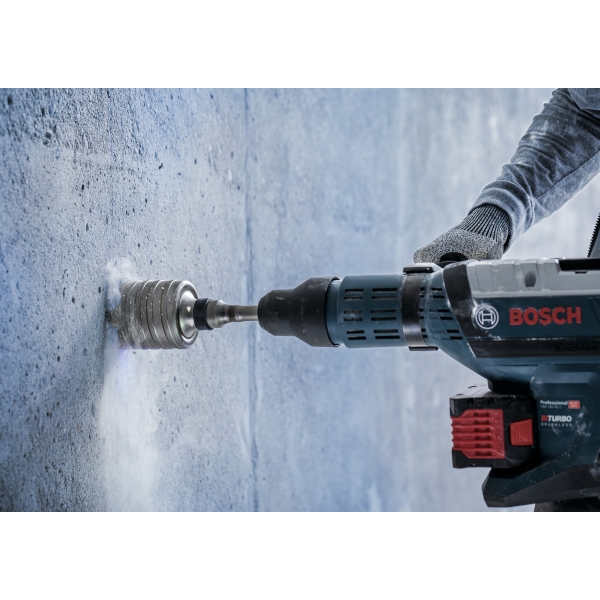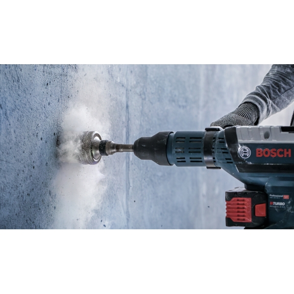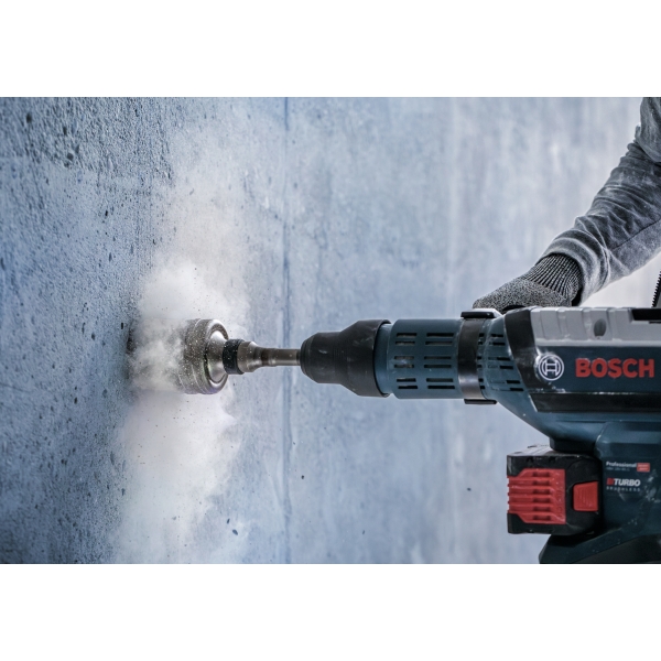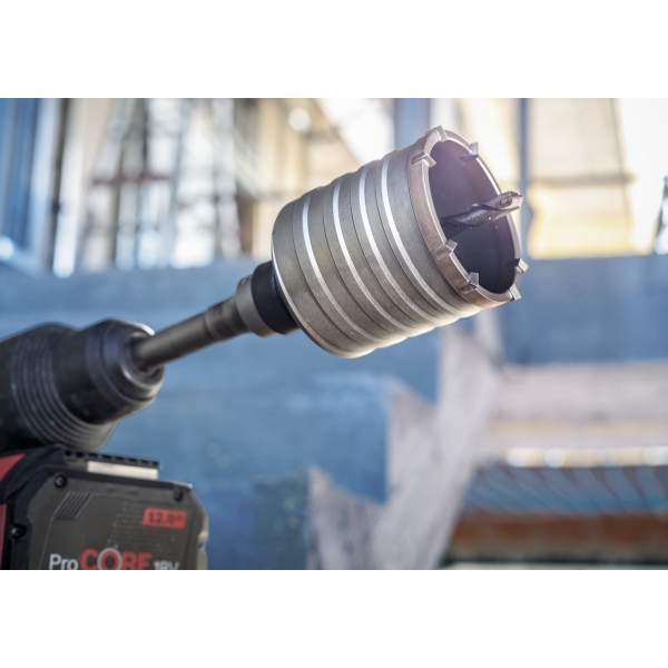 La broca sacanúcleos PRO SDS max-5 utiliza dientes de carburo resistentes para garantizar un corte preciso y una durabilidad excepcional. Los dientes son asimétricos y se adaptan al diámetro de la broca, lo que permite realizar fácilmente orificios profundos y precisos para cajas de interruptores y tuberías. Las dos ranuras de la broca eliminan eficazmente el polvo. Al ser un accesorio de una sola pieza, se obtiene la máxima transferencia de potencia de la herramienta eléctrica a la broca.