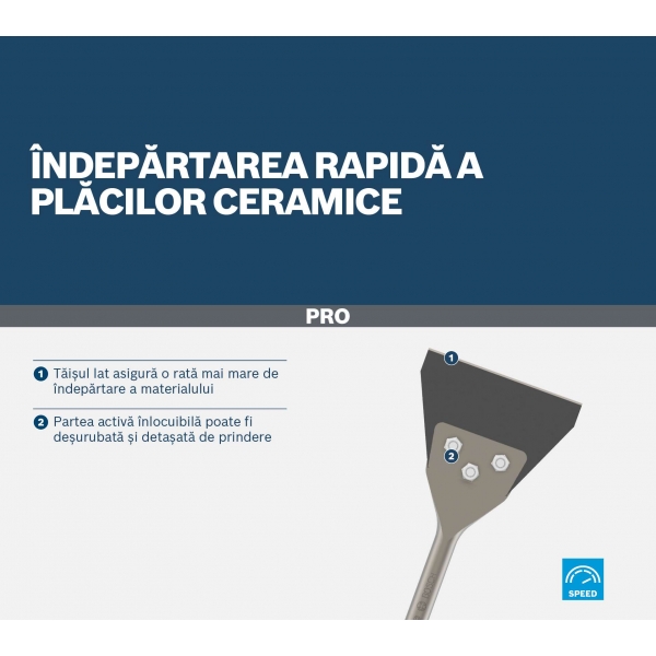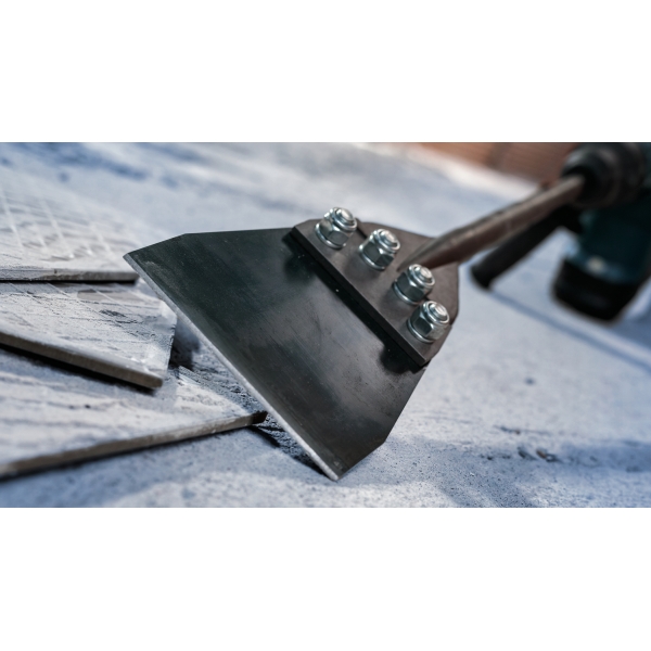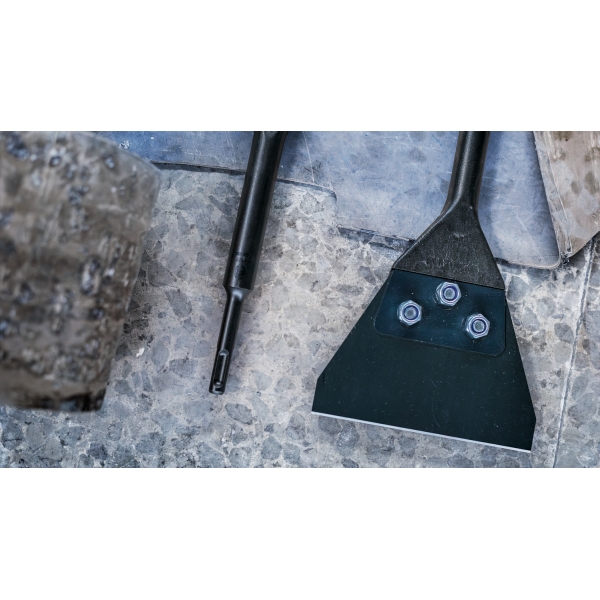 Diseñamos el raspador de suelos PRO SDS plus para renovadores que necesitan retirar rápidamente azulejos y piedra. Fabricamos la parte activa de 130 mm con acero resistente para garantizar su larga vida útil y la eliminación de más material que las hojas más pequeñas. Se fija al eje con tornillos y tuercas para reducir la vibración. Este cincel flexible también puede raspar mortero, alfombra, papel pintado y linóleo.