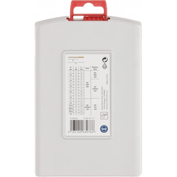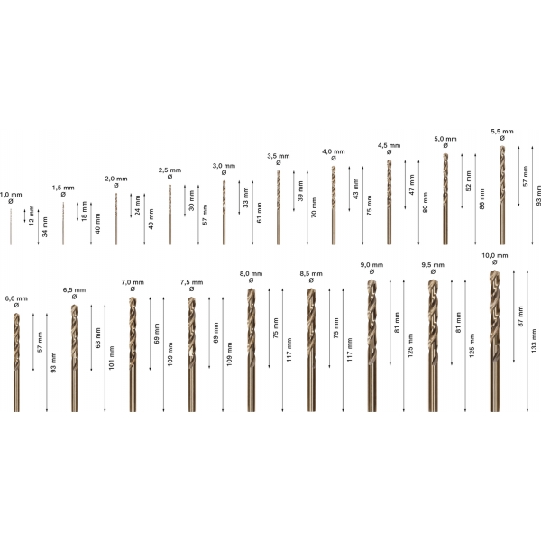 | Información adicional | Diámetro de la broca: 1, 1.5, 2, 2.5, 3, 3.5, 4, 4.5, 5, 5.5, 6, 6.5, 7, 7.5, 8, 8.5, 9, 9.5, 10 mm Longitud de trabajo: 12, 18, 24, 30, 33, 39, 43, 47, 52, 57, 57, 63, 69, 69, 75, 75, 81, 81, 87 mm |