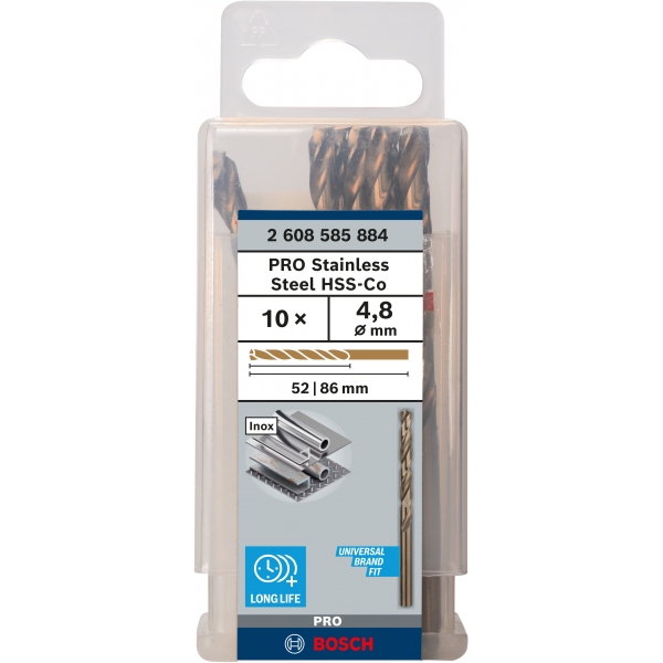 Bosch - PRO Stainless Steel HSS-Co - Juego de brocas para metal, HSS-CO, 4.8 mm, vástago cilíndrico, 10 piezas