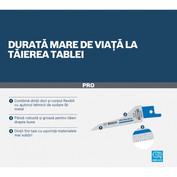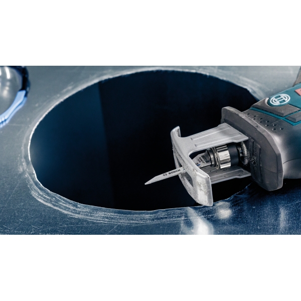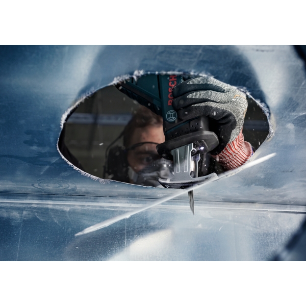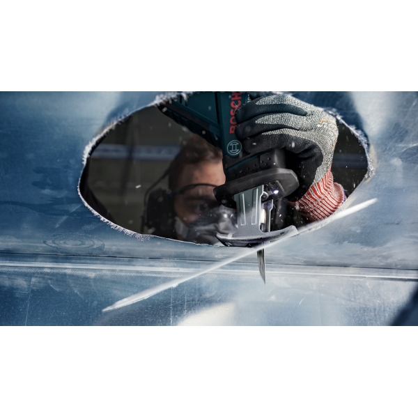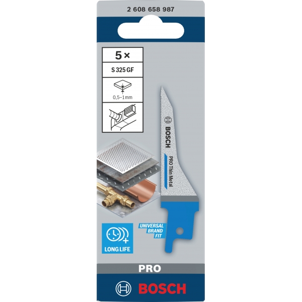 La hoja de sierra de sable PRO Thin Metal S325GF ha sido especialmente diseñada para cortar chapa metálica muy delgada, como la utilizada en aplicaciones de climatización. Su punta única está diseñada para penetrar directamente en la chapa metálica como una bayoneta, antes de arrancar la sierra, y luego cortar sin obstáculos gracias a sus dientes muy finos. Esta hoja es considerablemente más eficiente que las cizallas tradicionales para chapa metálica u otras hojas de sierra.