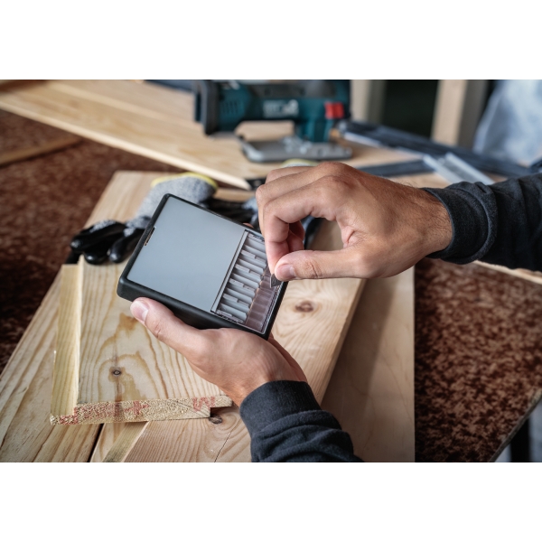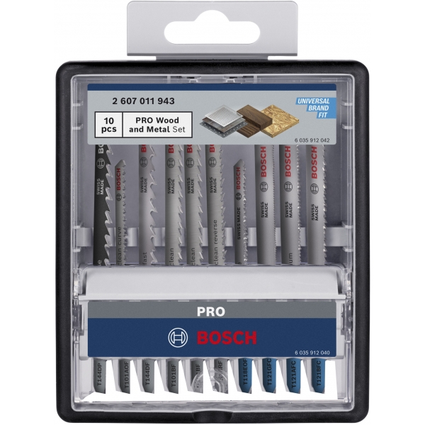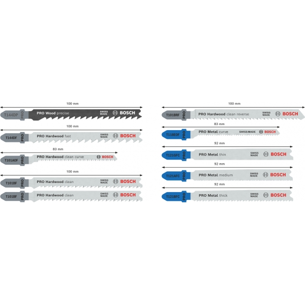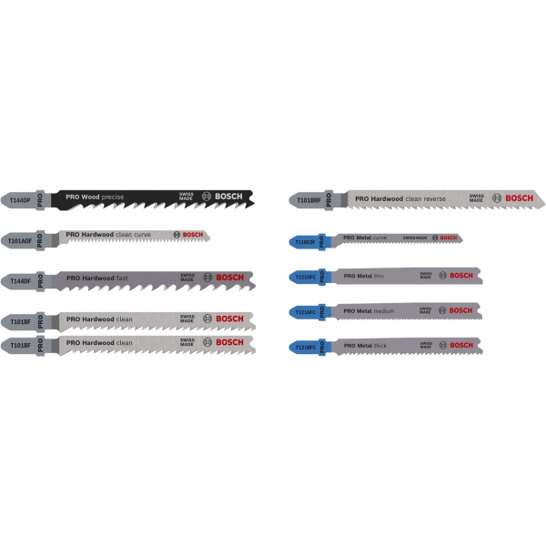El juego PRO para madera y metal incluye hojas de sierra de calar bimetálicas: cuentan con una banda de dientes de acero de alta velocidad (HSS) adherida a un cuerpo de acero de alto carbono (HCS) para mayor resistencia y durabilidad. Las hojas T121GFC, T121AFC y T121BFC cuentan con un recubrimiento adicional de AlTiN que proporciona una mayor resistencia al desgaste. Las hojas tienen diferentes formas y geometrías de dientes para garantizar que pueda abordar diversas aplicaciones de carpintería y metalistería con facilidad.