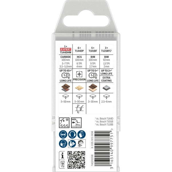 El juego PRO para madera y metal ofrece hojas de sierra caladora fabricadas en acero de alto carbono (HCS) y bimetálicas. Las hojas bimetálicas tienen dientes de acero de alta velocidad (HSS) unidos a un cuerpo de HCS para mayor resistencia y durabilidad. El juego incluye la resistente hoja de sierra caladora de carburo T144DHM con paso de diente progresivo para cortar materiales de cualquier grosor. La T121BFC cuenta con un recubrimiento adicional de AlTiN que proporciona mayor resistencia al desgaste. Las hojas tienen diferentes formas y geometrías de diente para garantizar que pueda cortar diferentes materiales con facilidad.