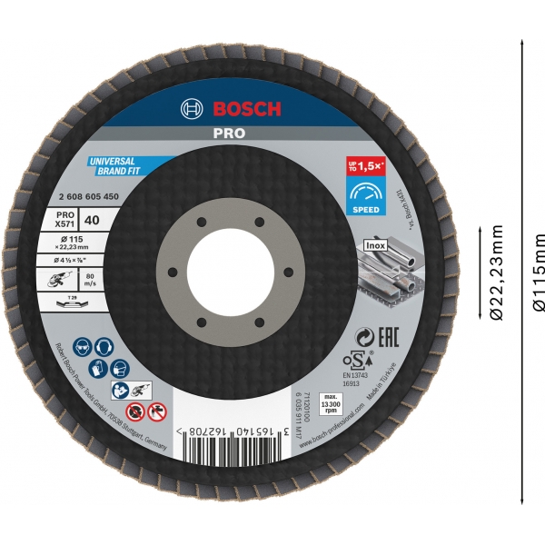 El disco de láminas PRO X571 cuenta con un soporte de tejido X para un lijado estable. La avanzada fusión de granos de óxido de aluminio y circonio garantiza una eliminación de material muy rápida y hace que este disco de láminas sea eficaz, incluso en acero templado.