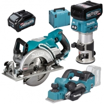 Juego de entrega | 1 x Makita - RT001GM210 XGT - Fresadora con 2 baterías, Li-Ion, 40 V, 4 Ah, 6,8 mm, estuche especial 2 baterías, Li-Ion, 40 V, 4 Ah Cargador rápido DC40RA XGT de 40 V máx. Estuche de transporte y almacenamiento 1 x Makita - KP001GZ XGT - Cepillo sin baterías ni cargador, Li-Ion, 40 V, - Ah, 82 mm 1 x Makita - RS001GZ XGT - Sierra circular sin baterías ni cargador, Li-Ion, 40 V, - Ah, 185 mm Cuchilla Efficut, 185x30x24T mm Llave hexagonal de 13 mm |