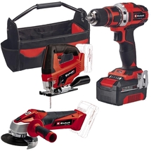 | Juego de entrega | TE-CD 18/40 Li BL PXC - Taladro y atornillador, 18 V, 40 Nm TC-AG 18/115 Li PXC - Amoladora angular, 18 V, 115 mm TC-JS 18 Li PXC - Sierra pendular, 18 V 1 batería, Li-Ion, 18 V, 4 Ah Cargador de batería 3 hojas de sierra para madera Disco cortante disco de lijado Protección para disco de corte Juego de bits Bolsa textil para transporte y almacenamiento. |