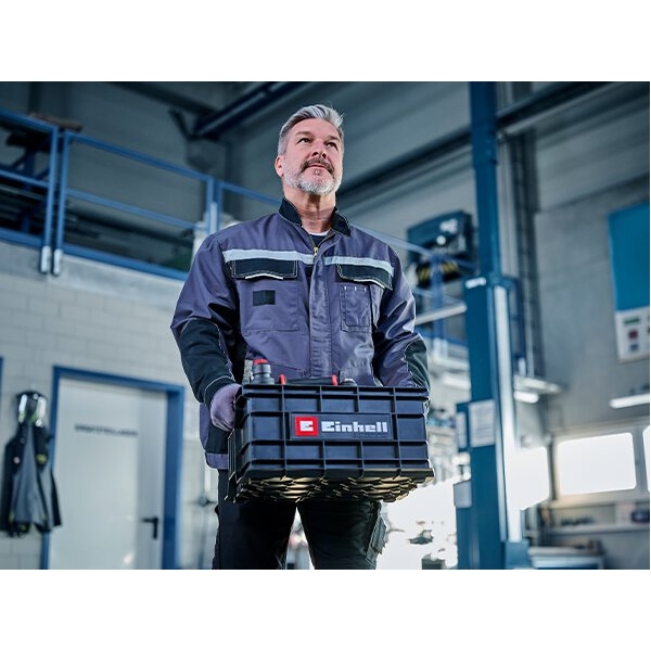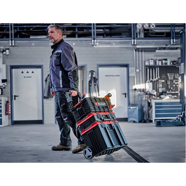 Almacenamiento seguro: el sistema de bloqueo permite conectar de forma segura la caja de herramientas al sistema Einhell E-Case y bloquearla en su posición.