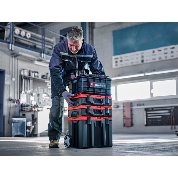 inglésSistema modular: la caja de herramientas Einhell E-Case forma parte del sistema de almacenamiento modular E-Case, que se puede combinar y apilar cómodamente.