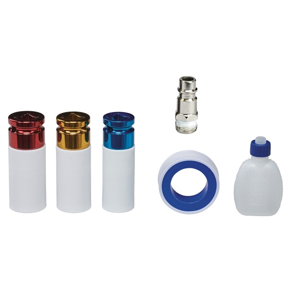 - Incluye 1 botella de aceite, 1 acoplamiento con tapón y 10 m de cinta de sellado de roscas.