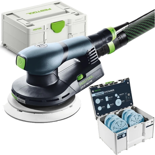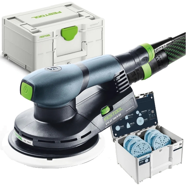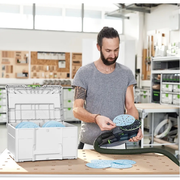 | Juego de entrega | Almohadilla de lijado ST D150/MJ2-M8-SW destornillador de cabeza abierta, 5 Cable Plug it H05 RN-F-4 Maletín de transporte y almacenamiento Systainer3 SYS3 M 187 Juego de hojas de lija redondas, 150 mm, grano mixto, 48 agujeros, 120 piezas SYS-STF D150 GR-Set |