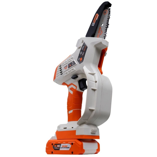 La eficiencia del motor eléctrico con escobillas se complementa con la batería Li-Ion de 20V y 4 Ah, que ofrece un mayor tiempo de funcionamiento y un menor tiempo de carga que las baterías tradicionales, por lo que el usuario podrá trabajar con la motosierra durante más tiempo sin tener que cargar la batería muy a menudo. La longitud máxima de corte es de 100 mm.