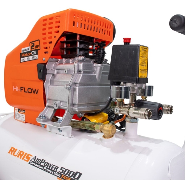 El cilindro de 50 litros del compresor RURIS Air Power 5000 con el que está equipado el compresor puede suministrar un gran volumen de aire para soportar una presión de 8 bar durante un largo período de tiempo.
