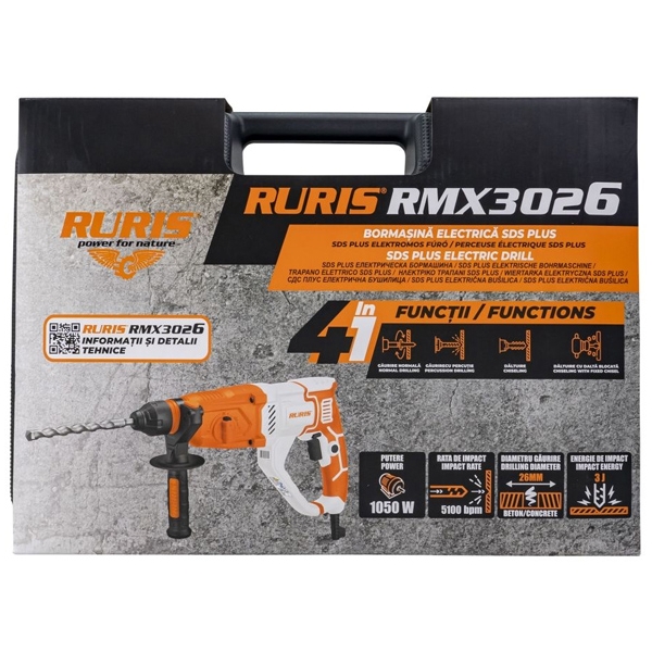 El martillo rotativo Ruris RMX3026 SDS Plus es una herramienta eléctrica eficiente y de alto rendimiento, diseñada para diversas aplicaciones de perforación y cincelado en materiales como acero, madera y hormigón.