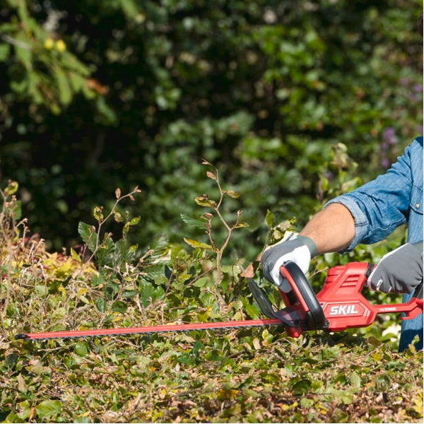 SKIL 0430 es un cortasetos con cordón para cortar setos y arbustos. Tiene una hoja de 55 cm de alta calidad con dientes reforzados de acero-carbono, pulida con diamante y cortada con láser. Cortar ramas gruesas no es un problema para SKIL 0430, con una distancia entre los dientes de la hoja de 20 mm y dependiendo de la sierra en los primeros dientes de la hoja. El diseño ergonómico con asa trasera de material suave y una práctica asa secundaria garantizan una comodidad óptima durante el trabajo. Debido a su bajo peso, puede operar fácilmente la herramienta en cualquier posición, por ejemplo, al realizar trabajos por encima de la cabeza. Puede trabajar junto a las paredes o cerca del suelo, gracias a la protección de la punta de la hoja. Esto evita daños en la punta de la hoja cuando las tijeras del cortasetos inalámbrico tocan una superficie dura. Debido al diseño exclusivo "Easy Storage" de la herramienta SKIL, requiere un mínimo de espacio de almacenamiento después de terminar el trabajo. SKIL 0430 AA está equipado con una cubierta de cuchilla y un gancho "Easy Storage".