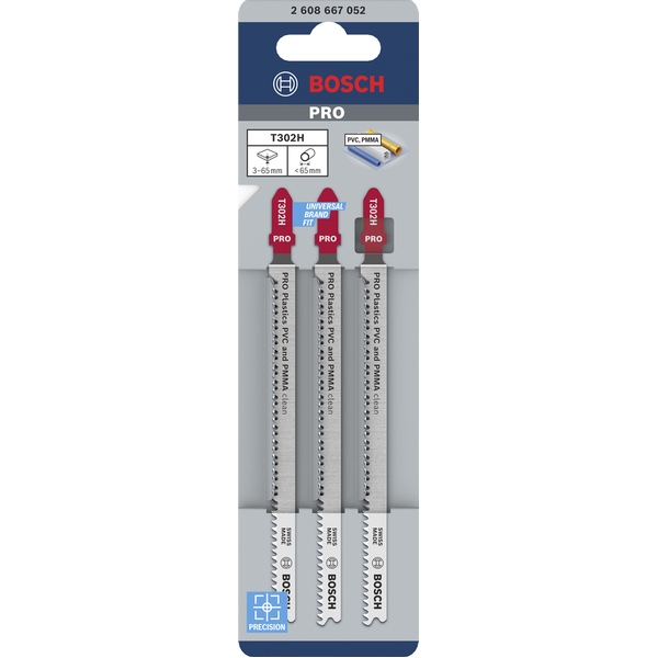 Bosch - PRO Plastics PVC and PMMA clean T302H - Juego de hojas de sierra pendular, varilla con un umbral de sujeción (T), 132 mm, plástico, corte re